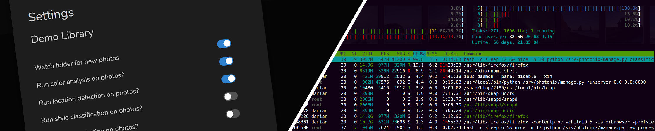 Through developing in public we found that some users with large collections and low powered devices like the Raspberry Pi were struggling to import their collection with all the image analysis features turned on. When we guide the user through setup the first time we allow them to choose which types of analysis should be run out of Color analysis (fast), Location identification (fast), Style recognition (medium) and Object detection (slow). These features can also be turned on or off with near immediate effect from within the settings dialogue. The slowest analyser (object detection) can take over 10 seconds per image which can really add up.