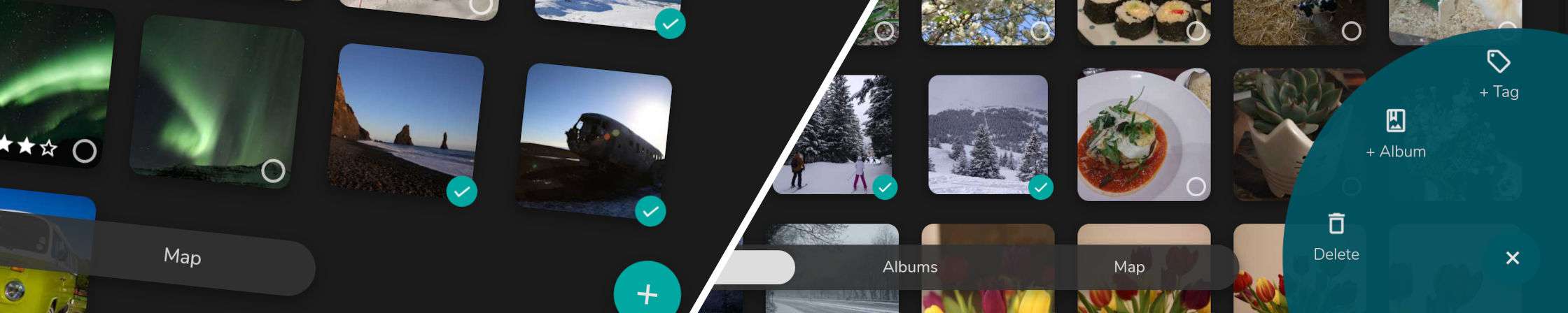 When you have selected enough photos you can choose an operation to apply to them. You do this by clicking the plus icon floating menu that is displayed in the bottom-right of the screen when you are in multiple selection mode. The menu expands to give you options currently consisting of adding to an album, adding a tag or deleting the photo.